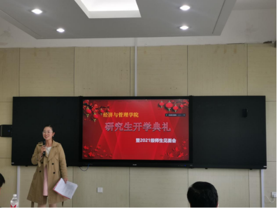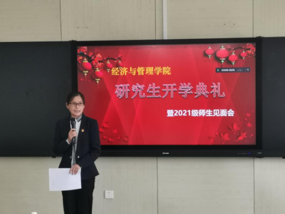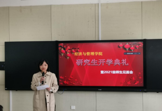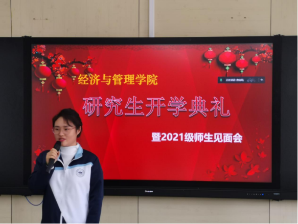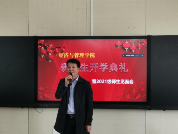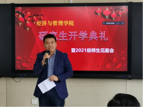 10月15日,太阳成集团tyc33455于经管楼418举办研究生开学典礼暨2021级研究生师生见面会。院长荆浩、党委书记高丹、国际教育学院党委书记吴景泰、校研究生院副院长崔楠、党委副书记孙莉、副院长李作学、研究生导师赵庆国、张波、教学秘书毛薇、研究生辅导员郭瀚涛、研究生招生主管郭宾雁以及2021级全体研究生采取线上线下相结合的方式参加此次会议。会议由主管研究生的唐金环副院长主持。
