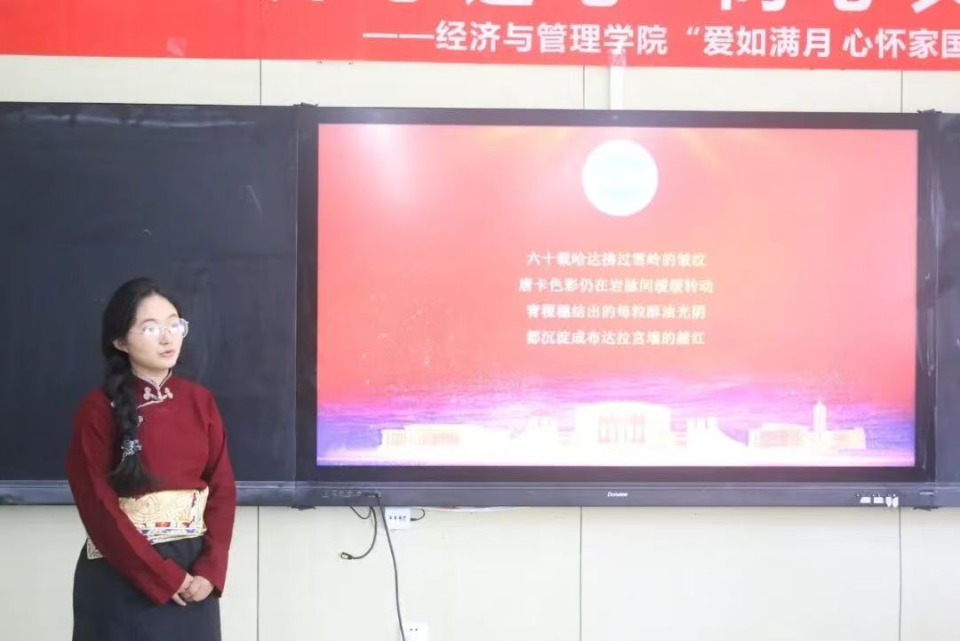 随后,2023级金融学专业藏族学生白玛曲珍带来以“铭记历史 心怀家国”为主题的诗歌朗诵《旗帜与足迹》。