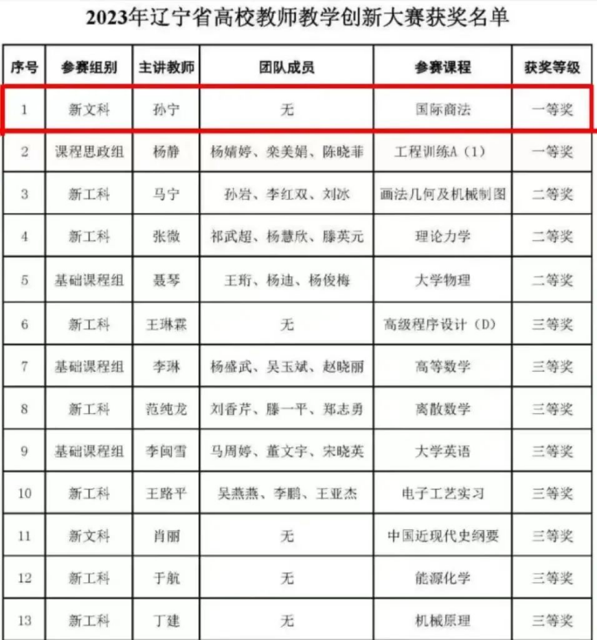 孙宁老师一直致力于课堂教学改革,2018年完成学校教改课题“翻转课堂在大学法律教学中的应用”;2011年完成学校教改课题“留学生中外合班授课模式的尝试”;2023年获批校级教改课题“线上线下混合课程智慧型生态课堂的研究及实践”;近年来,孙宁老师屡次代表学院参加各类教学比赛,获得了2020年辽宁省首届普通高等学校教师教学大赛三等奖;2021年获得太阳成集团tyc33455cc本科教学创新大赛 三等奖;2022年太阳成集团tyc33455cc本科教师教学创新大赛一等奖;2022年辽宁省本科教师教学创新大赛一等奖。