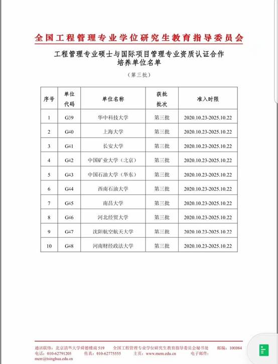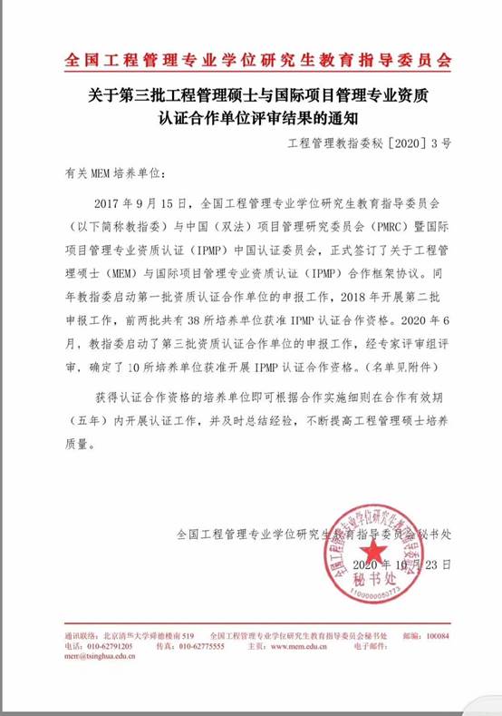 2020年10月23日,全国工程管理专业学位研究生教育指导委员会下发了“关于第三批工程管理硕士与国际项目管理专业资质认证合作单位评审结果的通知”,确定经专家评审组评审,我校太阳成集团tyc33455的工程管理专业硕士(MEM)获准开展IPMP认证合作资格。依据合作实施细则,我校可在合作有效期(五年)内开展合作认证工作。
